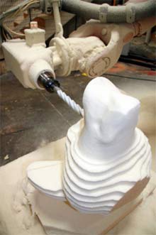 "我們可接受來自計算機的CAD文件,我們也可直接從實際模型獲取數據。” Holt 先生解釋道。"例如,假設我們面對一個6英寸長的恐龍雕刻,使用激光對原始模型進行掃描,我們可以告訴機器人我們需要加工出一條40英尺長的恐龍,而RMC就可以為我們加工出一個40英尺長的恐龍。”設計提交給RMC 后,僅需要幾個小時就可以雕刻出泡沫原型。