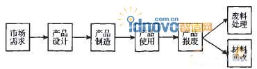 傳統(tǒng)設(shè)計是綠色設(shè)計的基礎(chǔ)。綠色設(shè)計是傳統(tǒng)設(shè)計的發(fā)展補充和完善。傳統(tǒng)設(shè)計只有在運用設(shè)計目標的基礎(chǔ)上把環(huán)境屬性也作為產(chǎn)品的設(shè)計目標之一,才能使所設(shè)計的產(chǎn)品滿足綠色性能要求,具有市場競爭力。二者在設(shè)計依據(jù)、設(shè)計人員、設(shè)計工藝、設(shè)計目的等方面都存在極大的不同,二者的比較,如表1所示。傳統(tǒng)制造模式的產(chǎn)品生命周期,如圖1所示。