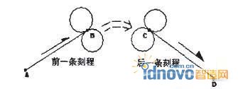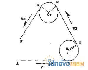 W1=V1×(O1一B)=V2×(O1一C),其中W1為轉(zhuǎn)動(dòng)方向也即兩個(gè)矢量的叉乘積,V1為前一條標(biāo)刻行程的矢量,O1為第一個(gè)切圓圓心,B為前一條標(biāo)刻行程的終點(diǎn),C為切線的起點(diǎn),V2為切線的矢量方向。