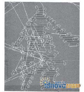 利用VC++平臺(tái)編程實(shí)現(xiàn)該優(yōu)化算法模塊并加入到華中科技大學(xué)快速成形中心的激光標(biāo)刻軟件PowerMarker系統(tǒng)后,載入一個(gè)PIT格式的紐扣標(biāo)刻圖案,其整體優(yōu)化效果如圖5所示,局部細(xì)節(jié)效果如圖6所示。其中的深色(綠色、黑色、藍(lán)色等)是標(biāo)刻路徑,白色是空行程。
