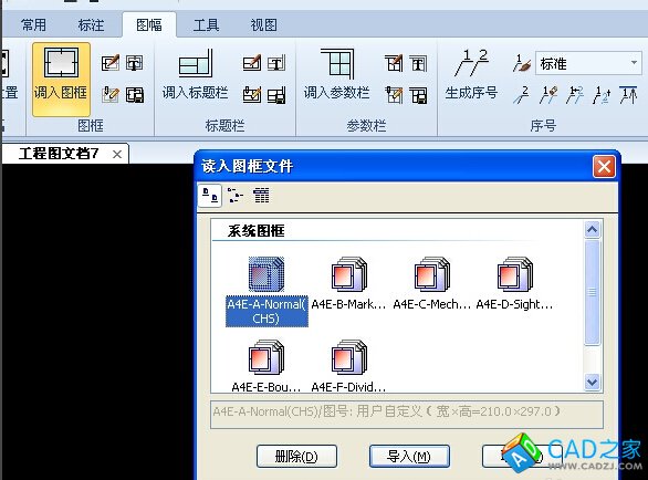 4、在菜單欄中選擇“圖幅”,圖框下的“調(diào)入標(biāo)題欄”命令。在讀入標(biāo)題欄文件夾中選擇自己喜歡的文件,并點(diǎn)擊導(dǎo)入