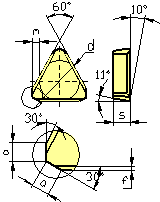 - 機(jī)械夾固式刀片毛坯(車刀片和銑刀片)的型號(hào)由型式代號(hào)、內(nèi)切圓直徑數(shù)字代號(hào)和刀尖圓弧半徑及刀片斷屑槽形代號(hào)(或銑刀片毛坯后角代號(hào))所級組成。