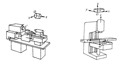 (6)工件運動時的相反方向 對于工件運動而不是刀具運動的機床,必須將前述為刀具運動所作的規定,作相反的安排。用帶“’”的字母,如+Y’,表示工件相對于刀具正向運動指令。而不帶“’”的字母,如+Y,則表示刀具相對于工件負向運動指令。二者表示的運動方向正好相反。對于編程人員只考慮不帶“’”的運動方向。對于機床制造者,則需要考慮帶“’”的運動方向。