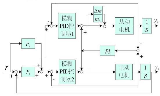 為了解決刀架在橫梁位置變化所引起的立柱兩邊等效慣量的變化破壞輸出的動態(tài)同步性能,采用負載動態(tài)補償方法調整比例增益,使兩電機保持同步。近年來,智能控制發(fā)展十分迅速,特別是模糊控制不完全依賴對象的數(shù)學模型,適于對具有不確定性的系統(tǒng)和非線性系統(tǒng)進行控制,有利于解決許多經典控制難以解決的問題。本文引入模糊PID控制器作為速度調節(jié)器,有效的利用了模糊控制的優(yōu)點,從而提高了同步控制精度。
