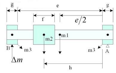 當龍門移動式鏜銑加工中心實現(xiàn)二維運動控制時,Y軸直線電機驅動的刀架位置變化往往會導致X軸直線電機等效慣量的改變,其中,從動電機由于不具有獨立的定位控制,容易受到等效慣量的改變而影響輸出,進而影響兩個X軸的輸出同步。這就要求采用負載動態(tài)補償?shù)姆椒ǎ{整比例增益并給X軸從動電機以控制補償,使得系統(tǒng)能夠保持同步運行。當電機等效慣量增加的時候,它的電流輸入與速度輸出之間的傳遞函數(shù)將會產生變化,即l/△mb->l/(mb+△m)。負載動態(tài)補償?shù)脑碚抢靡粋€權重調整電流輸入與速度輸出間的傳遞函數(shù),使其保持W/mb=W'/(mb+△m)的恒定關系,則W'=(1+△m/mb)*W。即為負載動態(tài)調變增益。其中W只是一個比例值,可定義為1。設計W`只需要求得△m即可。如圖3所示,定義長度e、f、g、h、及諸質量重心m1、m2、m3和A、B兩點。利用力矩平衡原理可以計算出B點承受結構(含m1、m2)等效質量△m的大小。