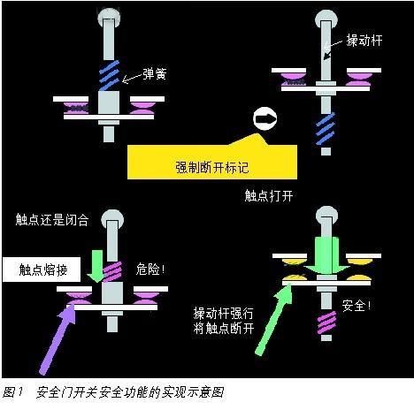 從結(jié)構(gòu)上看,非安全開(kāi)關(guān)通過(guò)彈簧施加的力來(lái)斷開(kāi)觸點(diǎn),而安全門(mén)開(kāi)關(guān)通過(guò)剛性操動(dòng)桿施加的力來(lái)斷開(kāi)觸點(diǎn)。觸點(diǎn)熔接和彈簧失效的情況下,本來(lái)應(yīng)該斷開(kāi)的觸點(diǎn)卻無(wú)法斷開(kāi),此時(shí)就無(wú)法確保安全。而安全門(mén)的剛性操動(dòng)桿,在此時(shí)可以強(qiáng)行斷開(kāi)觸點(diǎn),從而確保安全。因此,在實(shí)踐上往往在安全開(kāi)關(guān)上印上經(jīng)過(guò)認(rèn)證的"→"箭頭標(biāo)記如圖1所示。
