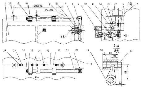 1.夾具底座 2.原菱形定位銷 3.M8螺釘 4.?5定位銷 5.原圓柱定位銷 6.過渡墊板 7.M8壓緊螺釘 8.惰輪軸 9.撥叉 10.反向撥桿 11.原2號撥桿 12.推桿 13.原傳動軸 14.原1號撥桿 15.調整墊片 16.定位油缸 17.新增菱形定位銷 18.底套 19.撥桿 20.?8定位銷 21.傳動軸 22.軸承座 23.墊板 24.M12壓緊螺釘 25.墊圈 26.小圓螺母 27.?12定位銷 28.原墊板壓緊螺釘