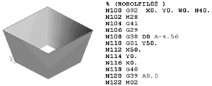 在實際產品的加工中,經常碰到產品的上下形狀各異或形狀大致相似而錐度不等的變錐度切割加工。針對這類產品常采用上下異形的編程方法,即將工件上下平面的輪廓按實際產品進行三維造型,然后利用CAM軟件的四軸聯動錐度切割的刀具軌跡進行編程,這種方式產生的程序量較大。圖3是某上圓下方的產品及其加工的程序。