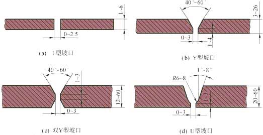 在焊接時為確保焊件能焊透,必須開一定形狀的坡口。焊件厚度小于6mm時,只需在接頭處留一定的間隙,就能保證焊透。但在焊較厚的工件時,就需要在焊接前,把焊件接頭處加工成一定的形狀,以確保焊透。對接接頭是采用最多的一種接頭型式,這種接頭常見的坡口型式有“Y”型坡口、雙“Y”型坡口當板厚達到20-60mm時,為減少焊接量并減小變形通常開“U”型坡口、雙“U”型坡口機組和型坡口,為防止焊接時燒穿,坡口處均應留一定的鈍邊。如圖2所示。