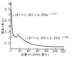 對設計公差與成本關系的建模方法應根據(jù)設計師所掌握的制造系統(tǒng)信息的不同而有所不同。在很多情況下,公差設計師不能獲取制造系統(tǒng)的詳細資料,不能確定設計公差所對應的工藝方法以及制造過程中的各種損耗,因此不能直接計算設計公差所對應的制造成本。但設計師能夠獲得一組經(jīng)驗公差—成本數(shù)據(jù),即某些公差值所對應的成本數(shù)據(jù)。這些公差值是間斷的,而設計師往往需要掌握各種精度范圍內(nèi)的公差—成本數(shù)據(jù)。也就是說,設計師需要掌握一條連續(xù)、完整的公差—成本關系曲線,而我們所已知的只是曲線上的一些離散點。此時即可利用曲線擬合法進行建模,在這些已知數(shù)據(jù)點的基礎上擬合出一條完整的公差—成本曲線,從而為設計師提供任意精度范圍內(nèi)的公差—成本關系。
