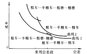 設計公差在制造系統(tǒng)中的實現(xiàn)總是通過一定的工藝序列完成的,如加工?80h7軸的工藝序列為粗車—半精車—精車。一定的工藝序列有其一定的加工能力范圍,當公差變化到一定程序時會引起工藝序列的變化,如粗車—半精車—粗磨—精磨。實驗證明,同一工藝序列的公差—成本曲線與工藝序列變化時的曲線有不同的特征。