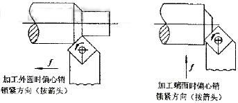 利用偏心銷旋轉將刀片夾緊在刀桿刀槽定位面時,必須選擇正確的旋轉方向,正確的旋轉(鎖緊)方向應該是使切削力和走刀方向一致。此時,刀片就能得到牢固的緊定,其旋轉示意圖如圖4所示。