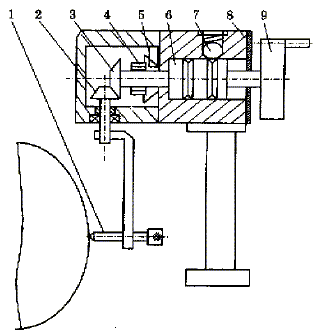 當磨削平面、外圓柱面時,需要修整的砂輪截面形狀平直,只需縱向移動修整筆,即可進行修整。移動手把9使中間軸6向右移,此時傘齒輪副2、3脫開,齒輪4與齒條5嚙合,再轉動手把9,由齒輪4傳動,通過齒條5使整個左端部分縱向移動并帶動修整筆1縱向移動,實現對砂輪的修整。此時為防止傘齒輪2旋轉,需用鎖緊螺釘將其鎖緊(圖中未繪出)。修整器左右兩個部分通過燕尾槽連接,并且要求其配合精度滿足縱向移動的精度要求。