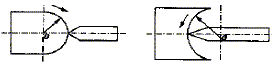 當需要修整的砂輪截面形狀為圓弧時,通過手把9使中間軸6左移,使傘齒輪2、3嚙合(如圖2所示的位置),同時使齒輪4與齒條5脫開。轉動手把9,通過中間軸6、傘齒輪副2、3將轉動傳遞到修整筆1上,使修整筆尖繞傘齒輪2的軸線旋轉擺動,為了保證在使用時保持嚙合狀態,需通過?位裝置7來實現。根據加工的要求不同,可通過轉動右面的滾花轉輪調整砂輪修整筆1筆尖的左右位置來實現對內外圓弧砂輪的修整(見圖2)。具體方法是(見圖3):修整內圓弧砂輪時向左移動修整筆,修整的砂輪為外圓弧時,則調整砂輪筆向右移動,使筆尖向右超過轉動軸軸線(即傘齒輪2的軸線),砂輪修整圓弧的半徑取決于筆尖與該轉動軸線的相對移動距離。