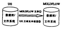 兩獨立系統間直接交換需開發雙向接口。每一方向的直接交換又可有兩種實現形式。下面討論從CAD到CAE方向的兩種形式,它們對并行設計信息共享效果不一樣。以基于UG和MOLDFLOW的注塑模并行設計為例,UG系統內有與MOLDFLOW的專用接口,假設MOLDFLOW也具有直接接受UG實體模型的專用接口。兩種形式如圖1。