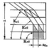 - 當(dāng)?shù)都獍霃讲瞀小于每組進(jìn)給量afz時(圖4a),為了得到銑削面積相等的最佳銑削圖形,在第1階刀齒主偏角Kr1a已知的條件下,第2階刀齒的主偏角Kr2a可由式(3)求得: