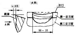 ②刃口產生如圖2所示的脆性崩刃,如剝皮似地沿第一、第二后刀面脫層崩刃,即刀具碎片以薄層形式從刀具后表面上剝落,刃口崩刃處局部有放射狀和人字形花紋,無疲勞源跡象,因此屬脆性崩刃。