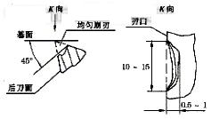 硬度是影響高速鋼刀具性能的重要指標之一。M42高速鋼(國外牌號)立銑刀經分級淬火后硬度達68~70HRC。由于硬度偏高,該刀具切削工件時,切削刃口很快發生崩刃,導致刀具快速失效。從失效刀具上可觀察到兩種崩刃形式:①刃口產生如圖1所示的均勻崩刃,在前、后刀面之間有一段刃口均勻缺損,產生的崩刃斜面與基面約呈45°角;