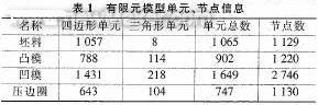有限元網格劃分的質量對于后續成型計算分析的結果有很大影響,劃分的有限元網格應盡可能反映出原曲面模型的形狀特征。本文選用美國EAT公司的板料成型有限元分析軟件DYNAFORM對模型進行曲面自動網格劃分,實現了對網格密度及形態的精確控制。在有限元單元的選擇上,鑒于計算效率和精度的考慮,選用BT單元,其單元、節點信息如表1所列。