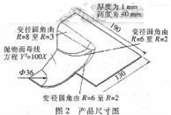 凹模圓角的取值合適與否直接關系到能否拉深成功。取值過小,則在材料流人凹模時彎曲阻力過大,引起直壁部分拉應力過大,導致出現頸縮,甚至拉裂等缺陷;取值過大,則有效壓料面積減小,致使切向壓應力增大,引起法蘭面起皺。該工件要求法蘭面與拋物面及直壁面相交處的圓角為r=2mm。但多次模擬結果表明,在定常壓邊力或直.線上升式壓邊力作用下會出現拉裂。綜合考慮成型質量和成型工藝要求,決定將工件此處圓角改為漸變式設計,其尺寸如圖2所示,然后在整形工序中再將此處圓角成型為r=2mm。同時,在有限元模型中,也將凹模圓角設計為此種漸變式形式。
