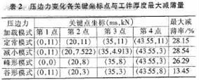 按照4種壓邊力加載模式,通過模擬計算出20個神經網絡訓練樣本,將4個關鍵點坐標作為輸人量,以工件減薄值為輸出量,以減薄量20為判別條件,求得既能拉深成功而且減薄值最小的點,即工件采用變壓邊力時對應的一些最優壓邊力控制點數據。