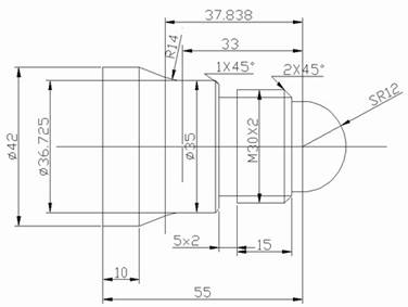 數(shù)控車床主要是加工回轉(zhuǎn)體零件,典型的加工表面不外乎外圓柱、外圓錐、螺紋、圓弧面、切槽等。例如,要加工形狀如圖所示的零件,采用手工編程方法比較合適。由于不同的數(shù)控系統(tǒng)其編程指令代碼有所不同,因此應(yīng)根據(jù)設(shè)備類型進(jìn)行編程。以西門(mén)子802S數(shù)控系統(tǒng)為例,應(yīng)進(jìn)行如下操作。