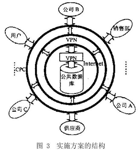 為開發(fā)某種新產(chǎn)品,位于不同國家的A 、B 、C 3 個企業(yè)的設計小組作為合作伙伴組成一個開發(fā)小組,他們將用一周的時間,通過Internet 來協(xié)同設計并制造出該產(chǎn)品。其中,C P C 軟件采用PTC 公司的Windchill,用以保證在產(chǎn)品開發(fā)過程的所有階段,3 個設計小組均能共享和訪問到信息;VPN 采用LinkTrust CyberwallTM 系列的防火墻技術,同時所有數(shù)據(jù)均組織在統(tǒng)一的數(shù)據(jù)庫環(huán)境下,用以確保在這3 個公司中生產(chǎn)的不同部件配合的天衣無縫。具體實施方案的結構如圖3 所示。