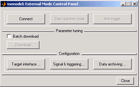 ld 請注意要保證lo文件在WindSh的工作路徑下。VxWorks實時程序定義了一個函數rt_main(),用來創建和執行模型代碼、完成與Simulink的通信(如果選擇了外部模式方式)。rt_main函數在文件rt_main.c中定義,這個文件位于目錄%matlabroot% twc ornado中。 在WindSh窗口中調用rt_main函數,開始運行程序:sp(rt_main,vxmodel,"-tf 100 -w ","*",0,30,17725) 參數的含義分別是: rt_main()是實時程序定義的函數,用來產生任務執行代碼和與Simulink進行通信; 運行后我們可以看到目標機上的屏幕上顯示: (5) 建立連接 在External Target Interface對話框中的MEX-file arguments指定目標機的IP、冗長度和TCP端口號,如圖6所示,就可以建立連接了。 圖6 External Target Interface對話框設置 打開External Mode Control Panel,如圖7所示。點擊Connect按鈕,執行Start real-time code,可以看到Scope上的圖形輸出。此時,可以改變模型的參數(如增益的數值),參數下載后Scope的曲線將隨之改變。仿真時間結束以后,可以看到產生了一個external.mat文件,由目標機會傳到主機,放在Tornado的安裝根目錄下。 圖7 External Mode Control Panel對話框 4、結論 針對Matlab的仿真特性和VxWorks操作系統的實時特點,本文介紹了RTW面向Tornado(VxWorks)實時目標的運行結構,并且較為詳細的闡述了Tornado(VxWorks)實時目標的具體實現流程,實現了Simulink在Tornado(VxWorks)實時目標下的仿真。#p#分頁標題#e# 在結合相關文檔的同時,筆者加入了親身實驗的經驗,增補了一些必要的內容,完善了實驗的具體步驟,降低了為讀者今后實驗的調試難度。