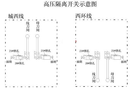 1、拉出城西線隔離開關母刀閘上彈力鎖的插銷,拉下母刀閘,再拉出線刀閘上彈力鎖的插銷,拉下線刀閘。