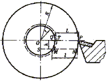 假設(shè)正常刀尖高時(shí),刀具從P點(diǎn)切削到Q點(diǎn),徑向進(jìn)給尺寸為L(zhǎng),如刀尖低于工件軸心線高度為h,則刀具實(shí)際切削路徑變成從N到M點(diǎn)就開(kāi)始了小外圓的切削,即PQ=NM=L,此時(shí)以O(shè)點(diǎn)為圓心,OM為半徑作圓,交OP于T點(diǎn),這樣小外圓的尺寸誤差即為QT,設(shè)QT=d,d的大小可通過(guò)下面的幾何運(yùn)算求得。
