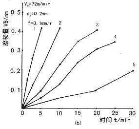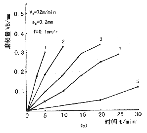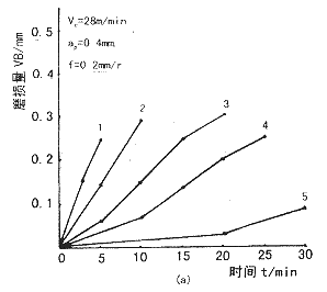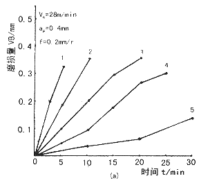- 比較圖1和圖2中同號曲線可知,同一種復合材料,切削加工參數②條件下對刀具的磨損速度比參數①條件下快,碳化硅顆粒尺寸越大,這種差別越大。這是由于切削速度不同所致,切削參數②的切削速度大,碳化硅硬顆粒對刀具的撞擊、磨損機會越多,刀具的磨損速度也就越快。 #p#分頁標題#e#
