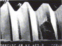 - 失效分析表明,未鍍膜絲錐在崩刃失效時,其鄰齒切削刃及齒頂已發(fā)生嚴重磨損(見圖2a),而鍍膜絲錐崩刃失效后,其鄰齒的切削刃尚未見磨損跡象(見圖2b)。這就說明以崩刃方式失效時,沒有發(fā)揮鍍膜的耐磨潛力。這在絲錐效能試驗和用戶報告中絲錐壽命與失效方式的關系中得到充分證實。