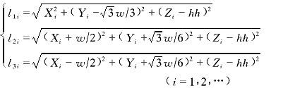 (1)- 虛擬軸機床的運動學逆解是控制系統軟件設計的關鍵之一。通過本虛擬軸機床的運動學逆解方程(2)得到的[l1il2i l3i]T(i=1,2,…)便是控制虛擬軸機床所需的桿的長度。