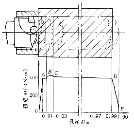 - 鉆頭所有刀齒切入工件后,切削扭矩達到最大。由于導向塊端部與鉆頭外刃刀尖之間的軸向位置之差,導向塊仍然停留在導向套內(nèi),這時扭矩不會發(fā)生明顯變化,見圖1中的AB段,這段距離亦稱為導向塊滯后量。