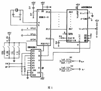 此部分電路包括單片機(jī)AT89C2051,多路模擬開關(guān)CD4051,A/D轉(zhuǎn)換器ADC0804等(圖1)。