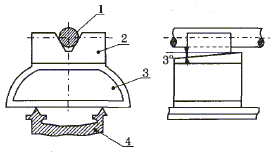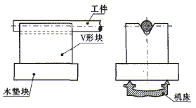粗車時,可采用如圖1所示的支架,支架由V形塊和木墊塊組成,木墊塊壓在機床導軌上。半精車、精車時可采用如圖2所示的托架,托架是在加工過程中起減振作用的主要輔具,托架由兩塊制有3°斜面的木質(紅松)托塊組成,上托塊的上面制成V型托口,這可使工件與上托塊在互相作用時能夠形成不完全碰撞,受力時一部分功能將受到損失,以達到減小反作用力的目的。根據實踐經驗,V型夾角a=30°~50°為宜,輔具安放數量視工件長徑比及工件長度而定,當長徑比大于80、工件長大于1500mm以上時,每隔600~800mm放置一個。