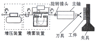在干式切削加工中,選擇了潤滑、冷卻和排屑性能優良的半干式切削加工,霧狀切削劑供給方式把外部混合內部供給方式作為研究開發的主要內容(見圖3)。外部混合方式與赫克斯公司等提倡的內部混合方式比較,其可供給的噴霧量少。但作為技術核心的噴霧生成部分開發的自由度大、主軸內部結構不需做大的改動,因此,可在所有制造廠家生產的設備上采用。
