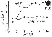 由于鉆削加工單位時間內切屑的切除體積大,所以散熱性很差。現以M6的底孔為例,其目標值進給速度設定為6000mm/min。在開始基礎試驗中,由于切屑粘刀造成切屑在鉆溝中堵塞而導致鉆頭折斷(見圖5)。在提高轉數度試驗時發現,鉆削能否正常進行與鉆尖的溫度密切相關(見圖6),根據圖7所示,為此對鉆尖折斷的過程進行推測,把鉆頭溫度作為評價的項目之一進行了研究。