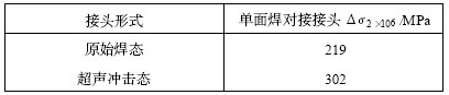 原始焊態(tài)與超聲沖擊處理態(tài)的單面焊雙面成型對接接頭試件的疲勞試驗結(jié)果見表2。