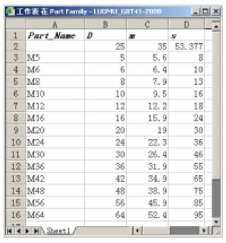 利用UGNX的Part families工具可以方便的定義零件主要參數生成系列化零件數據庫。進入Tools—〉Part families,選取表達式中的D、m、s作為提取參數,設置好保存目錄,選擇Create命令進入Excel工作表。在Excel里面,根據標準零件系列尺寸或標準件的標準規格尺寸錄入零件控制參數的值。如圖5所示。保存族并退出Part families,帶Excel參數表的三維零件樣板生成。