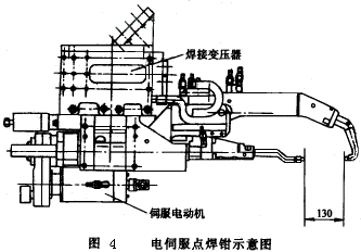 (2)點焊機器人的焊接裝備 點焊機器人的焊接裝備,由于采用了一體化焊鉗,焊接變壓器裝在焊鉗后面,所以變壓器必須盡量小型化。對于容量較小的變壓器可以用50Hz工頻交流,而對于容量較大的變壓器,已經開始采用逆變技術把50Hz工頻交流變為600~700Hz交流,使變壓器的體積減少、減輕。變壓后可以直接用600~700Hz交流電焊接,也可以再進行二次整流,用直流電焊接。焊接參數由定時器調節,參見圖1b。新型定時器已經微機化,因此機器人控制柜可以直接控制定時器,無需另配接口。點焊機器人的焊鉗,通常用氣動的焊鉗,氣動焊鉗兩個電極之間的開口度一般只有兩級沖程。而且電極壓力一旦調定后是不能隨意變化的。近年來出現一種新的電伺服點焊鉗,如圖4所示。焊鉗的張開和閉合由伺服電機驅動,碼盤反饋,使這種焊鉗的張開度可以根據實際需要任意選定并預置。而且電極間的壓緊力也可以無級調節。這種新的電伺服點焊鉗具有如下優點: