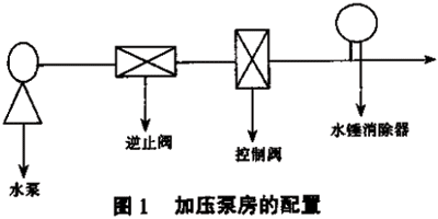 據不完全統計,加壓泵房的事故90%以上出現在水泵及其出水管位置,其余10%出現在電力及其他方面,而在90%之中又有90%是出現在水泵的出水口配置上,主要表現為:閥門關閉不嚴、爆裂及重大水錘事故。所以加壓泵房的事故頻發點集中在水泵出口的配置上,這與傳統的配置有著直接關系,見圖1。