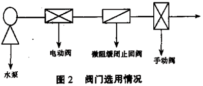 3)水泵出口的逆止閥,在水錘壓力的沖擊之下,常出現關閉不嚴和閥板破碎的現象。而單一依靠一個水錘消除器來消除水錘,是根本不可能的,所以急切需要一種可以徹底消除水錘的裝置。天津市國威給排水設備制造有限公司生產的增壓泵自控閥就是針對以上的一些弊端開發生產的,完全可以解決以上的一些問題,而且不用人工和電力操作,是一種新型的節能產品。大同市自來水公司二水廠于!##$ 年底進行改建,在設計中起先沒有接觸到該產品,仍選擇傳統工藝流程,閥門選用情況如圖2。