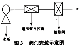 當設計人員及公司領導接觸了增壓泵自控閥后,經過認真調查,細致分析比較后,得出一致結論:微阻緩閉止回閥最大缺點是關閉不嚴,且損壞率極高,往往是在用過一次或幾次后,閥門便損壞,須維修,而此新型水力閥門可以代替多個閥門,即只安一閥便可完全替代電動閥、微阻緩閉止回閥及排氣閥的全部功能。因此,在實際安裝中決定使用該閥。該產品的安裝簡單方便,只需在水泵的出水口安裝該閥,然后加一檢修閥門即可,無需任何的電器元件配套,可以完全消除水錘,所以省去水錘消除器,大大地節省了安裝空間,見圖3。