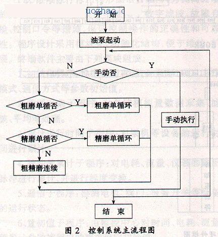 軟件結構根據控制要求而設計,主要劃分為四大模塊:即手動模塊,粗磨單循環模塊,精磨單循環模塊,循環啟動(先粗磨后精磨)模塊,由于整個軟件結構的路程圖較多,這里僅給出主程序流程圖見圖2