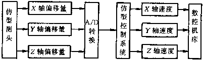數(shù)控仿形測量和加工的基本原理如圖1所示。數(shù)控仿形測量和加工的過程可以表述如下:數(shù)控仿形測量和加工,首先利用三維接觸式或非接觸式模擬測頭檢測實(shí)物模型的表面信息(主要指測頭變形偏移量和它在機(jī)床坐標(biāo)系中的坐標(biāo)值),然后由A/D轉(zhuǎn)換電路把模擬量轉(zhuǎn)換成數(shù)字量(有些數(shù)字化測頭直接輸出數(shù)字量)。仿形控制系統(tǒng)根據(jù)所測得的信息,按照仿形控制策略分配各個(gè)坐標(biāo)軸的進(jìn)給速度,并且把所分配的速度送給數(shù)控平臺,由數(shù)控系統(tǒng)驅(qū)動(dòng)各軸電機(jī),完成仿形測量和加工的全部動(dòng)作。因此數(shù)控仿形加工的控制過程可以概括為數(shù)據(jù)獲取、數(shù)據(jù)處理、決策和控制四個(gè)階段。
