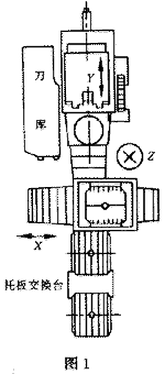 圖1為70年代生產(chǎn)的SABO-630加工中心示意圖,其主要參數(shù):托板工作臺面630mm×630mm;工作臺分度數(shù)4×90°;X軸行程850mm;Y軸行程630mm;Z軸行程750mm;X、Y、Z快移速度10m/min;主軸功率11kW;主軸轉(zhuǎn)速16~3550r/min;刀庫容量60或40把;換刀方式:機械手換刀。
