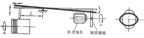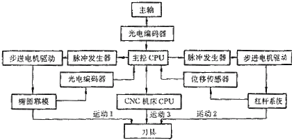 為了實現(xiàn)刀具的高頻微位移進給,在考慮了硬靠模的優(yōu)點后,采用如圖4所示的原理,以步進電機作為驅(qū)動源,通過一杠桿結(jié)構(gòu)將橢圓靠模的高速旋轉(zhuǎn)化為刀具的高頻微位移進給。為避免在加工過程中出現(xiàn)刀具往復(fù)運動頻率和主軸旋轉(zhuǎn)頻率的不協(xié)調(diào),使得所加工的活塞出現(xiàn)變形,系統(tǒng)在主軸和靠模上均安裝上光電編碼器,并以光電編碼器的輸出信號作為反饋信號,由主控CPU進行快速甄別,不斷改變步進電機驅(qū)動源的控制信號頻率以調(diào)整步進電機的轉(zhuǎn)速,實現(xiàn)橢圓靠模和主軸的位置同步,保證加工工件和橢圓靠模的相位的一致性。