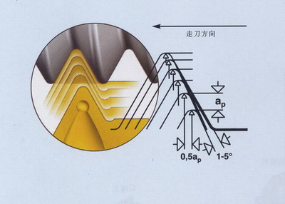 精車時切削量小,可采用徑向垂直進刀,以保證螺紋牙型準確,精度高,并可獲得好的表面粗糙度。粗車時切削量大,如果采用徑向垂直進刀,考慮到兩條刃同時切削,因為輥體壁厚較小(δ16mm),輥子剛性較差,加工中易產生振動;徑向垂直進刀會形成V形切屑,切削熱量大,刀尖圓角易過載,所以我們采用改進式側向進刀。這樣可獲得扁平卷曲切屑,排屑良好,切削熱量小,刀具壽命長,如圖7所示。#p#分頁標題#e#