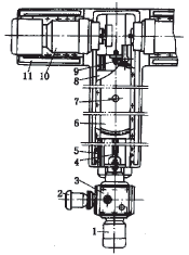 專(zhuān)用機(jī)床的結(jié)構(gòu)見(jiàn)圖2,它主要由床身、動(dòng)力頭、工作臺(tái)、機(jī)械滑臺(tái)等部件組成。動(dòng)力頭10安裝在床身11上面的T形槽中,可以左右移動(dòng)一定距離,以適合不同規(guī)格的前軸。它由電動(dòng)機(jī)、變速箱、銑刀盤(pán)等部件組成。根據(jù)需要調(diào)整好兩動(dòng)力頭的相對(duì)位置后,用螺栓固定動(dòng)力頭。為防止動(dòng)力頭在工作時(shí)受工件反作用力的推動(dòng)而產(chǎn)生位移,影響加工精度,床身上有一個(gè)調(diào)整螺栓頂緊動(dòng)力頭上的電動(dòng)機(jī)座。動(dòng)力頭上的轉(zhuǎn)動(dòng)軸可使銑刀盤(pán)沿左右方向作很小的移動(dòng),以達(dá)到所需要的工作位置。工作臺(tái)6安裝在滑臺(tái)8上,工作臺(tái)下面有螺母,靠絲杠傳遞動(dòng)力。工作臺(tái)6上面有一個(gè)定位銷(xiāo)7與夾具相配合,定位銷(xiāo)的前后有環(huán)形T形槽。工作臺(tái)的前端有縱向T形槽;后端有條垂直刻線,并通過(guò)定位銷(xiāo)7的中心。電動(dòng)機(jī)1使工作臺(tái)快進(jìn),電動(dòng)機(jī)2使工作臺(tái)工進(jìn)。工作臺(tái)下面的行程開(kāi)關(guān),用于控制工作臺(tái)快進(jìn)、工進(jìn)、快退的工作循環(huán)。2 夾具結(jié)構(gòu)